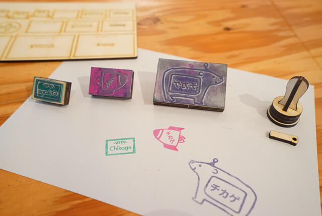 いくつかあるデザインパターンからデザインを選んでいただいたらお名前を入れスタンプ面を作ります。その後レーザーカッターでスタンプ面カット。お待ちいただいている間にスタンプ台を組み立て、カットしたスタンプ面を貼付け完成! ※当日はサンプルのリボンやお持ち帰りいただけるインクを用意いたします。