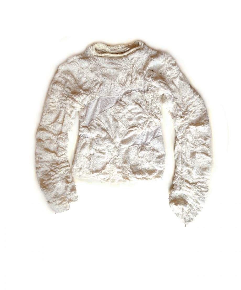 Knit sweater where the knit pattern was dependent on the shades of colour created by the bacteria, creating a haptic pattern.