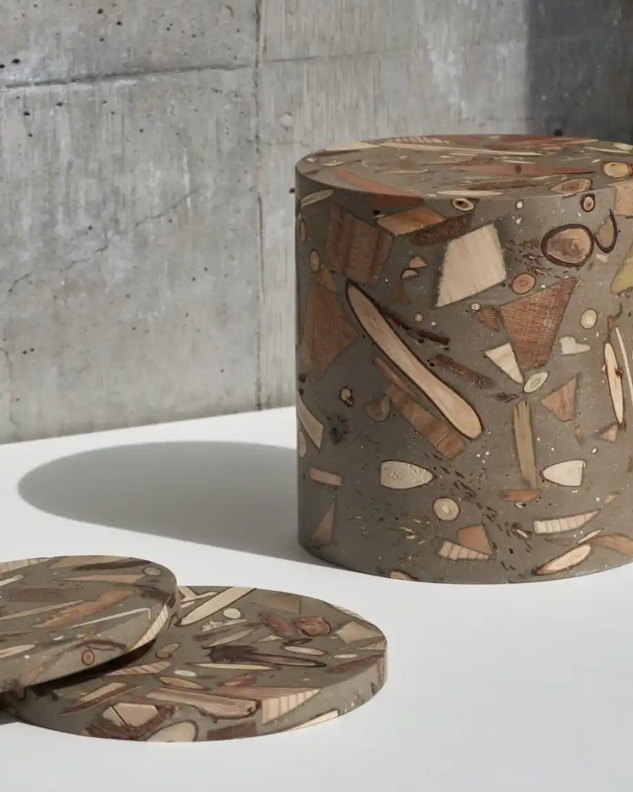 As part of the Jesmonite Lab exhibition, creators will also get a glimpse of ‘ForestBank’ product prototypes. Created by Yuma Kano, the unconventional new material was made using Jesmonite and discarded forest materials.