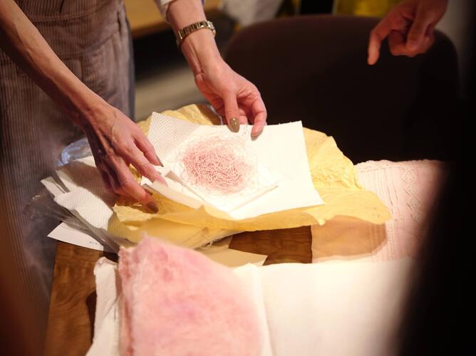 Silk fibres dyed pink with bacteria and spun into thread by Sachiko Sakairi