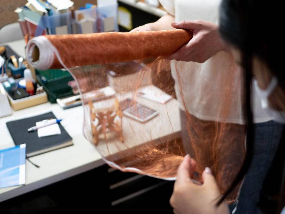 Her research is practice-based rather than theoretical using actual design methods drawn from evidence in historic books and materials. She has recreated Old chirimen fabric to compare its quality with current chirimen fabric and show its material qualities outside its usual cultural context of the kimono.