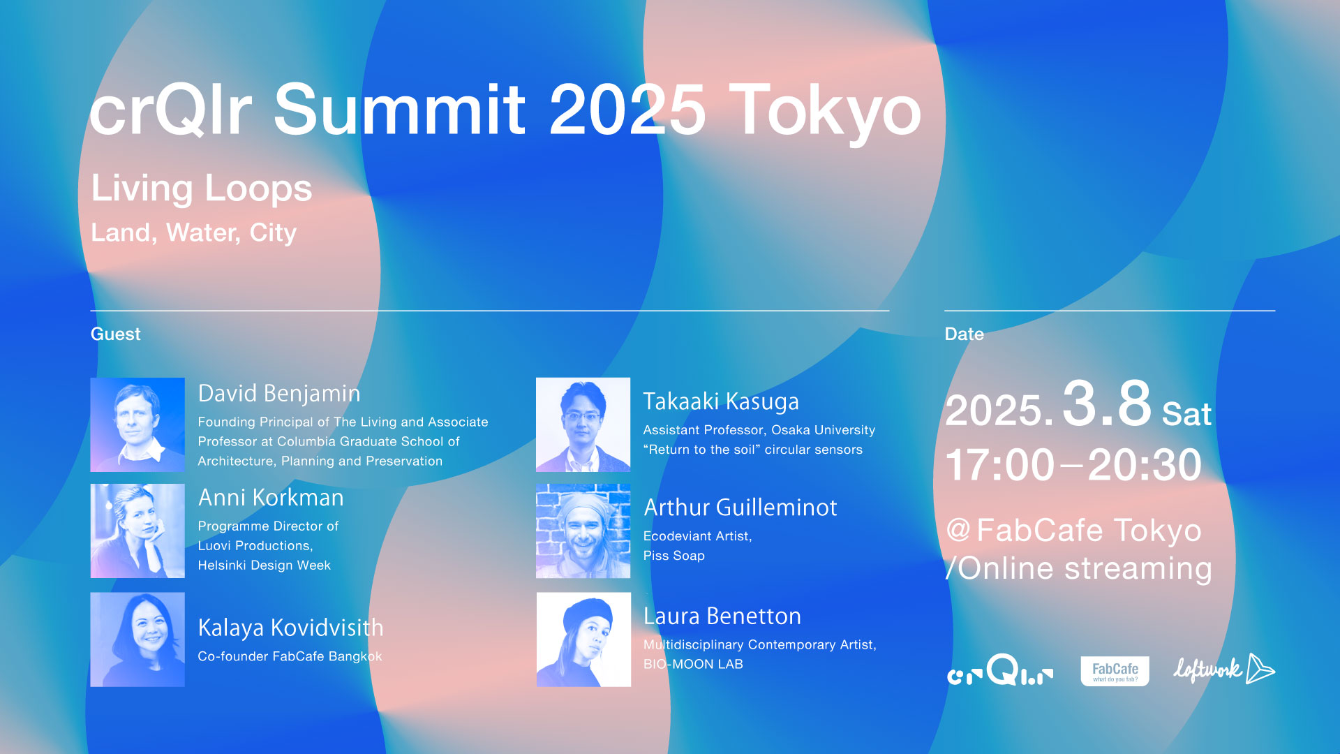 The Summit will take place at FabCafe Tokyo, alongside the crQlr Awards Exhibition Tokyo. Don't miss the opportunity to join this dynamic talk session on circular design powered by nature, available in person and via live online broadcast.