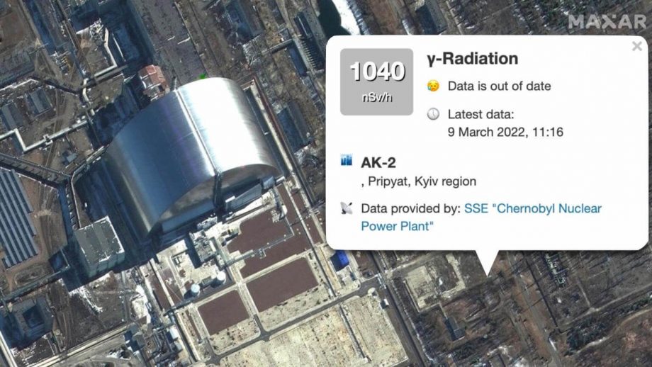 Satellite view of Chernobyl NPP on March 10, 2022 (Credit: MAXAR). Overlay: Nearby gov’t data readout, March 14, 2022, by SaveEcoBot.