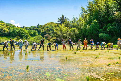 Hakcerfarm community members working together on the rice paddy in the Japanese countryside.