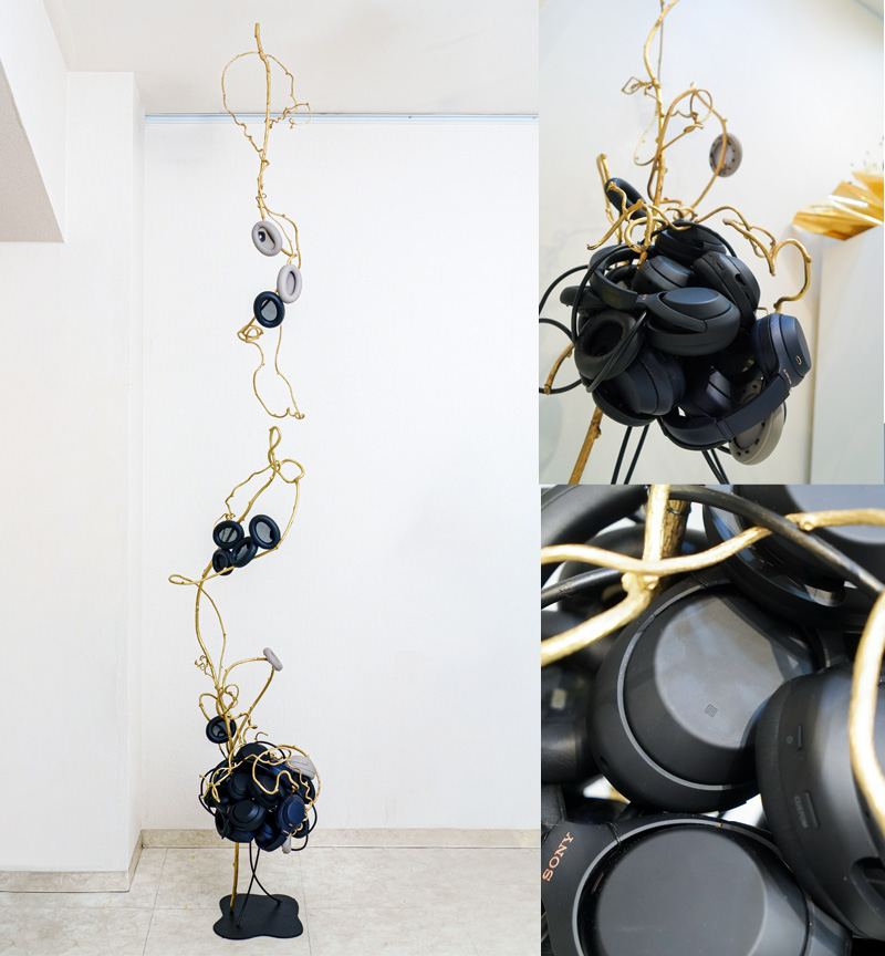 A new work from the original series “HanaTec”, featuring a headphone as the central element. Inspired by the Sogetsu technique of “disassemble and rearrange,” parts that are normally overlooked—such as ear pads and bands—are reconstructed as the main materials. Placed by the window at FabCafe, the piece subtly introduces both the aesthetic beauty and slight dissonance of the product.