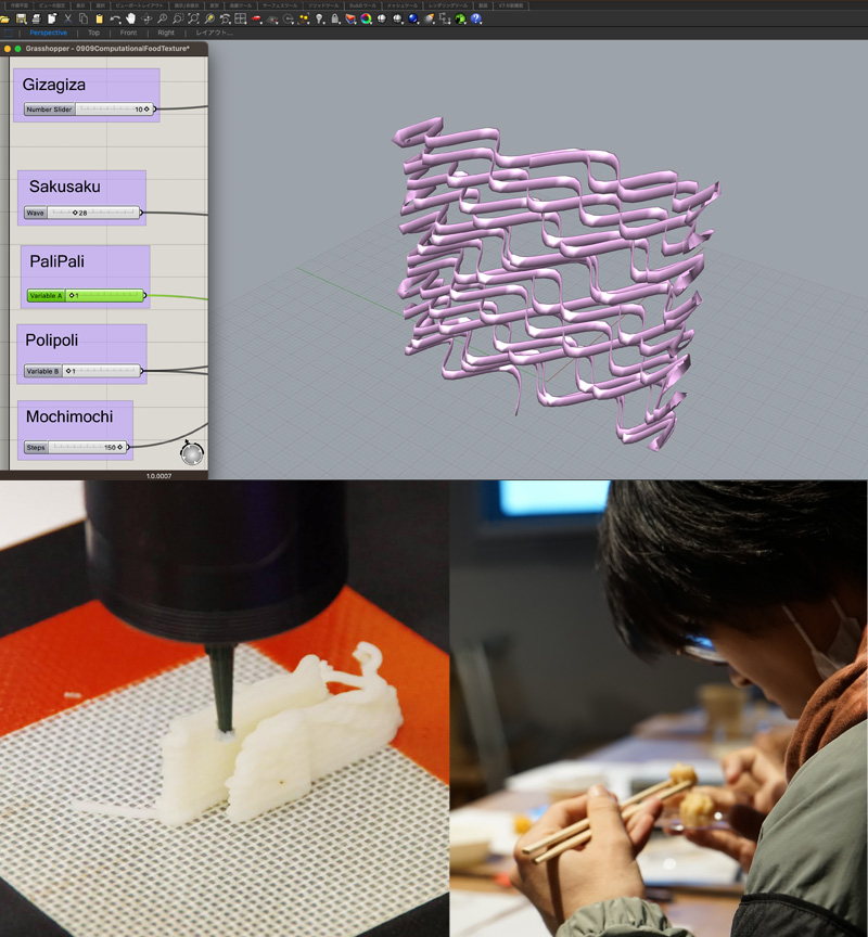 Byte BitesA system called the “Texture Generator” that creates textures from words. Using OpenAI, it can generate textures even from abstract and free expressions such as “spring, blooming in the night sky.” The system converts prompts into parameters by evaluating the similarity between descriptive words and texture elements like “jiggly” or “crispy,” then calculates the internal structure and how it breaks down in the mouth, producing a detailed 3D model. This model is output using a 3D food printer, designing entirely new textures and flavors.