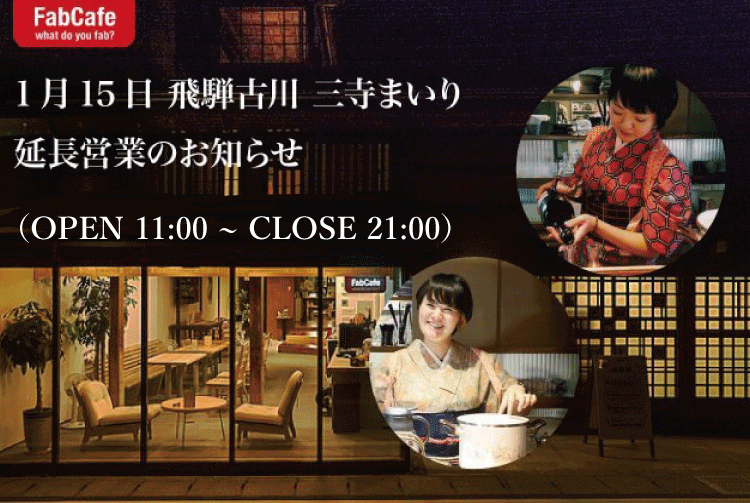当日FabCafe Hidaでは、特別営業時間(Open11:00~Close21:00)で営業いたします。