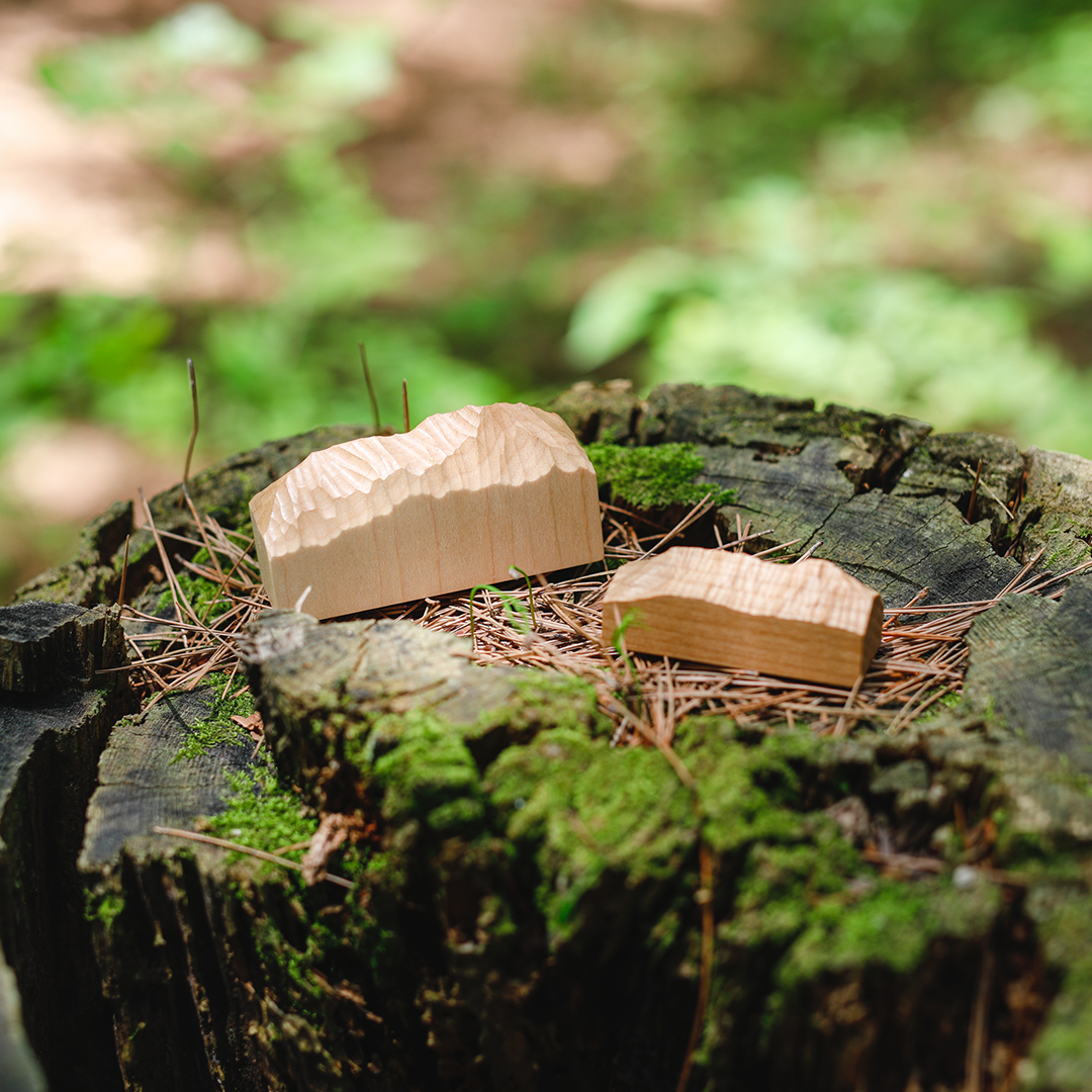 木彫りする山は、7cm×4cm程度のタモ材(モクセイ科トネリコ属 落葉広葉樹)。柔らかめの木なので、初めての方でも安心して、彫刻刀で彫ることができます。