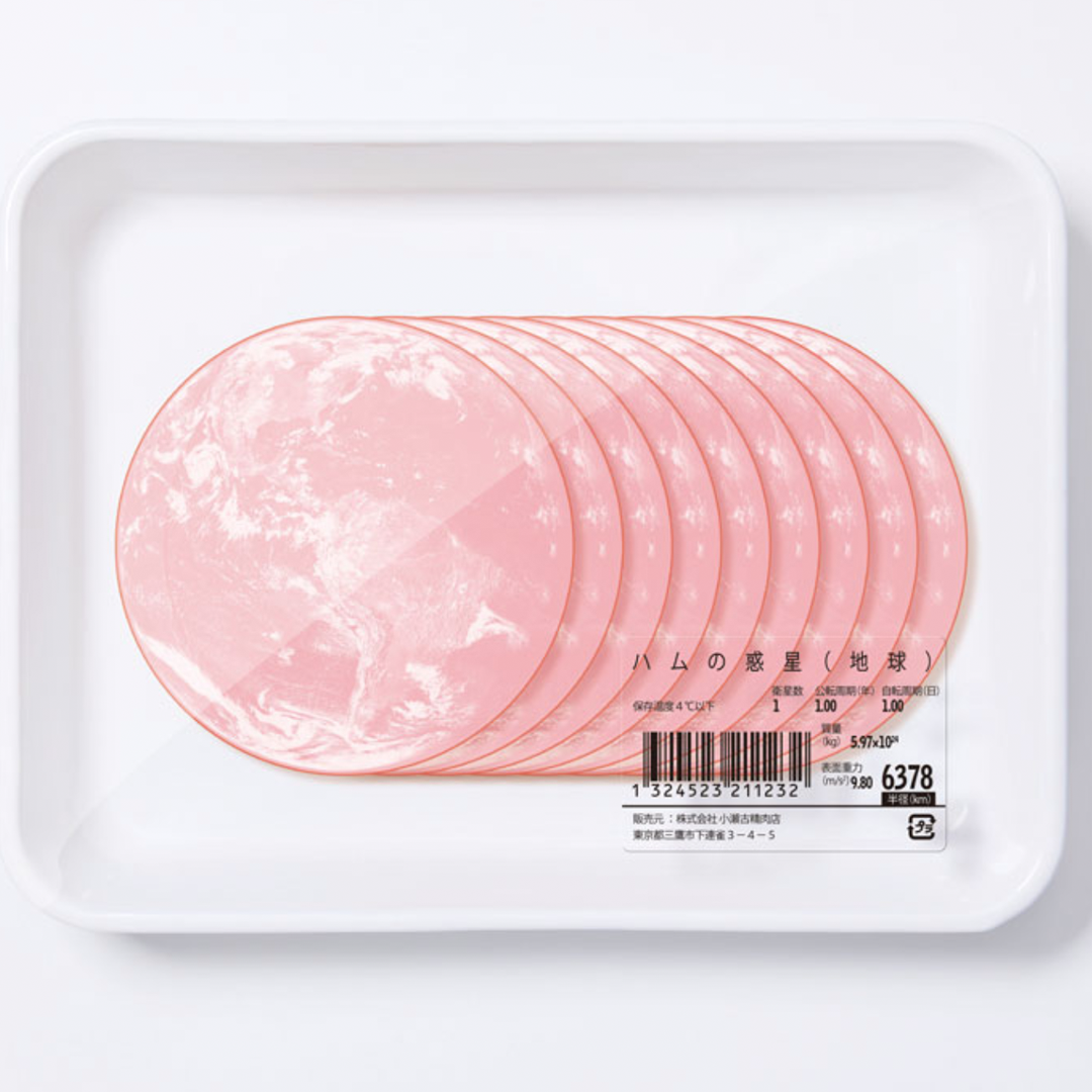「物事の見え方が変わる」のが擬態デザインの特徴で、本イベントのメインビジュアル「ハムの惑星」は、地球がハムに擬態する作品で、地球の写真をピンク色に染め、大気を流れる雲を美味しそうな脂身に見立てています。