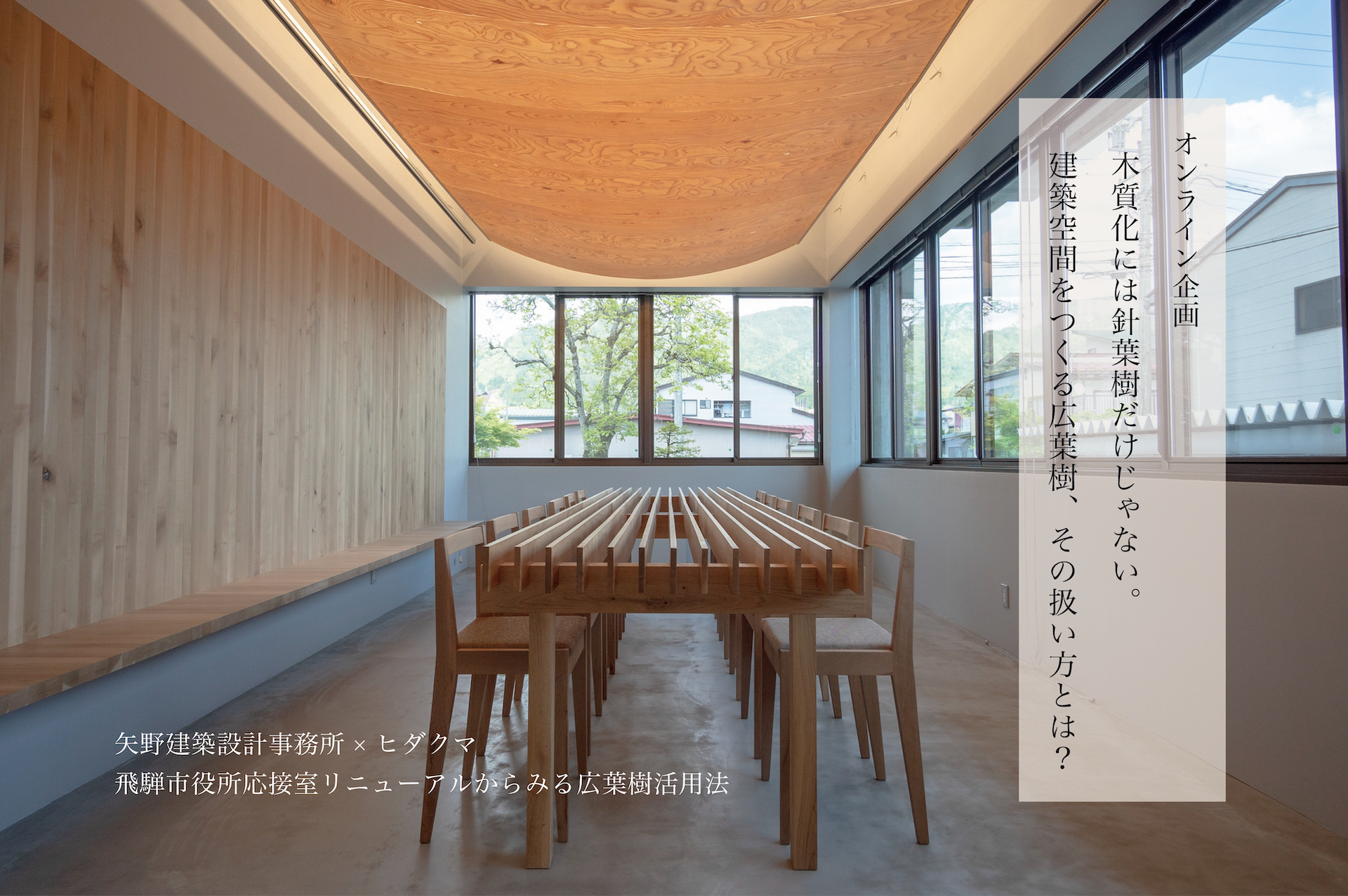 この度、ヒダクマ/FabCafe Hidaは「飛騨市役所応接室リニューアル」の事例を通して、広葉樹を活用した建築空間の魅力と、国・地域産材を使った空間の木質化の意義を考えるオンラインイベントを開催します。ゲストには、設計を担当した矢野建築設計事務所の矢野泰司さん・雄司さん。そして飛騨市役所応接室木質化事業を担当した飛騨市林業振興課の竹田さんも参加予定です。