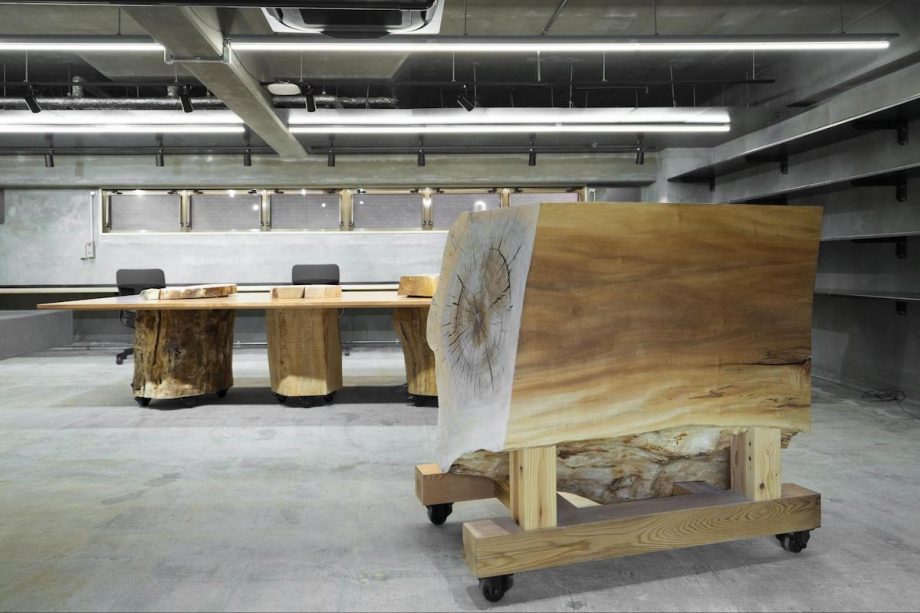 ソニーCSL京都は「人類のゆたかさに貢献する」という理念の元に、研究室の在り方を思索しながら、少しずつ機能を拡大していく実験的な空間として開設しました。その空間に置かれ存在感を放つのは、巨大な丸太をそのまま活かした家具たち。自然素材ならではの荒々しさや、宝石のようにカットされ静謐な印象を持つ家具からは、ディテールへのこだわりを感じます。