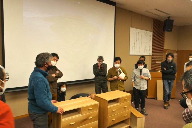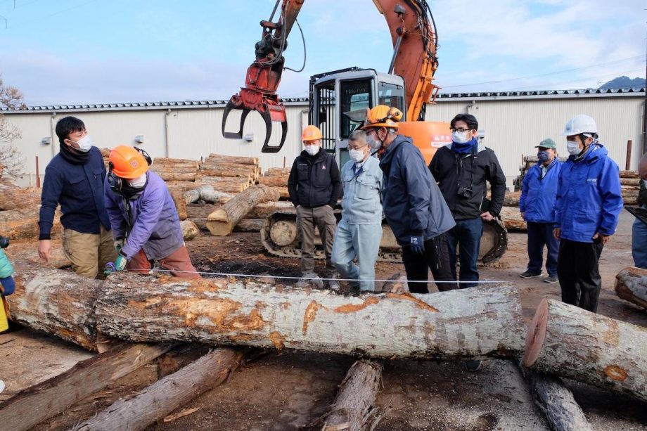 飛騨地域の木を伐る人・製材する人・製造・加工する作り手などが集まって情報共有する現地検討会の様子。