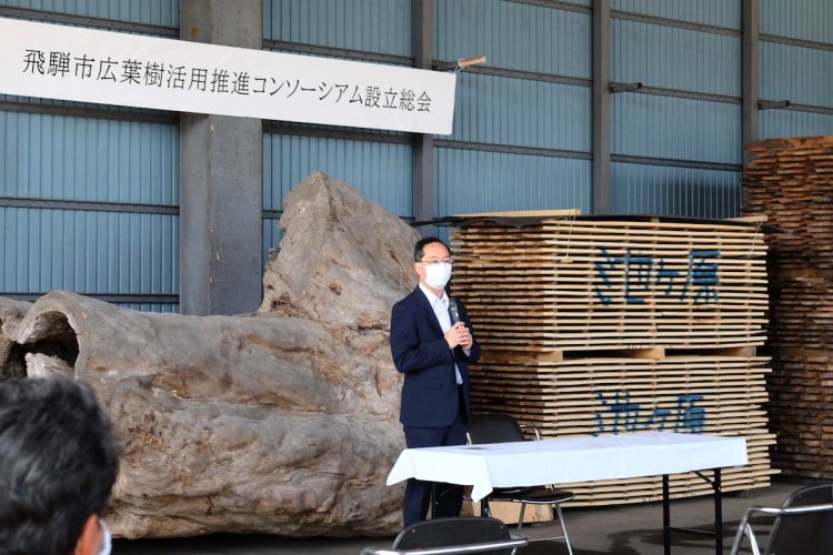 昨年発足した「飛騨市広葉樹活用推進コンソーシアム」は、飛騨市・高山市内から素材生産者、製材事業者、建築業者、木製品製造者が参加している。