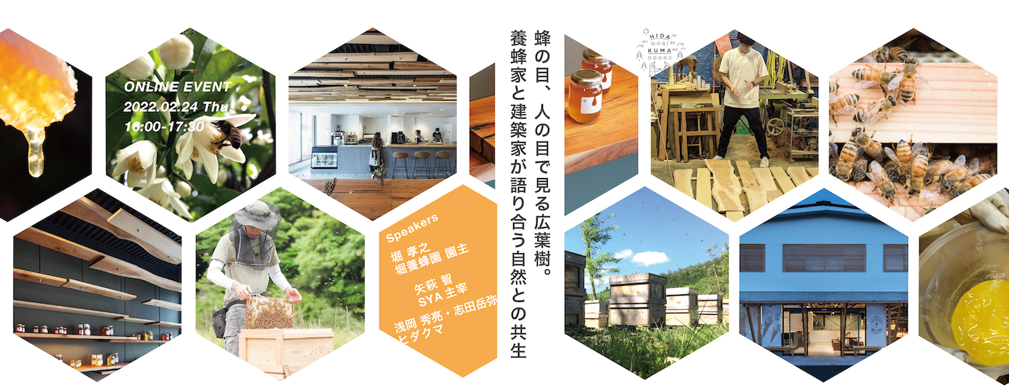 ヒダクマ / FabCafe Hidaは2月24日(木)、堀さん、矢萩さんをお招きしたオンラインイベントを開催します。イベント前半では、養蜂家と建築家、それぞれの視点が捉える木についてトーク。後半からは、製作ディレクションを担当したヒダクマの浅岡もトークに参加。自身にとって新鮮だったという、養蜂と広葉樹の関わりを深掘りします。「蜜や」の空間解説あり、三者のトークセッションありと、盛りだくさんなイベントです。皆さま、奮ってご参加ください。