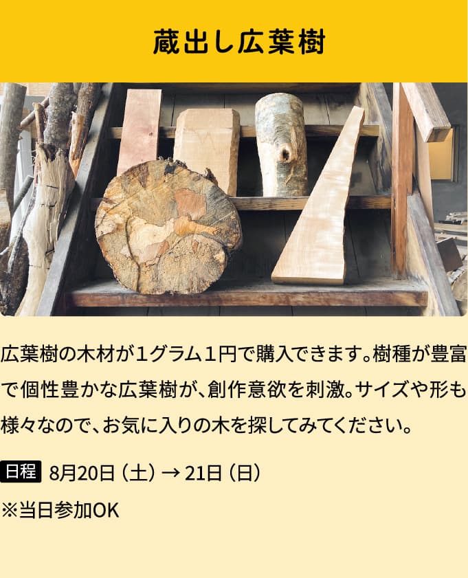 当日はスタッフ一押しのユニークな飛騨の広葉樹をいくつかピックアップして展示&販売致します。木の特徴、樹種に詳しい蔵出し広葉樹マスターがいますので、お気軽にお声掛けください。