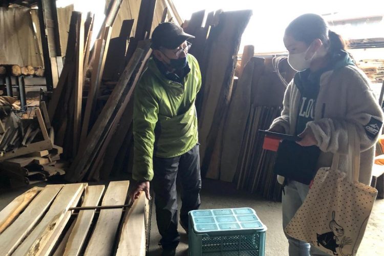 ツアーでは広葉樹専門の西野製材所にも訪問予定。写真は本ツアーに興味を持って地元の中学生が見に来てくれた時の様子。