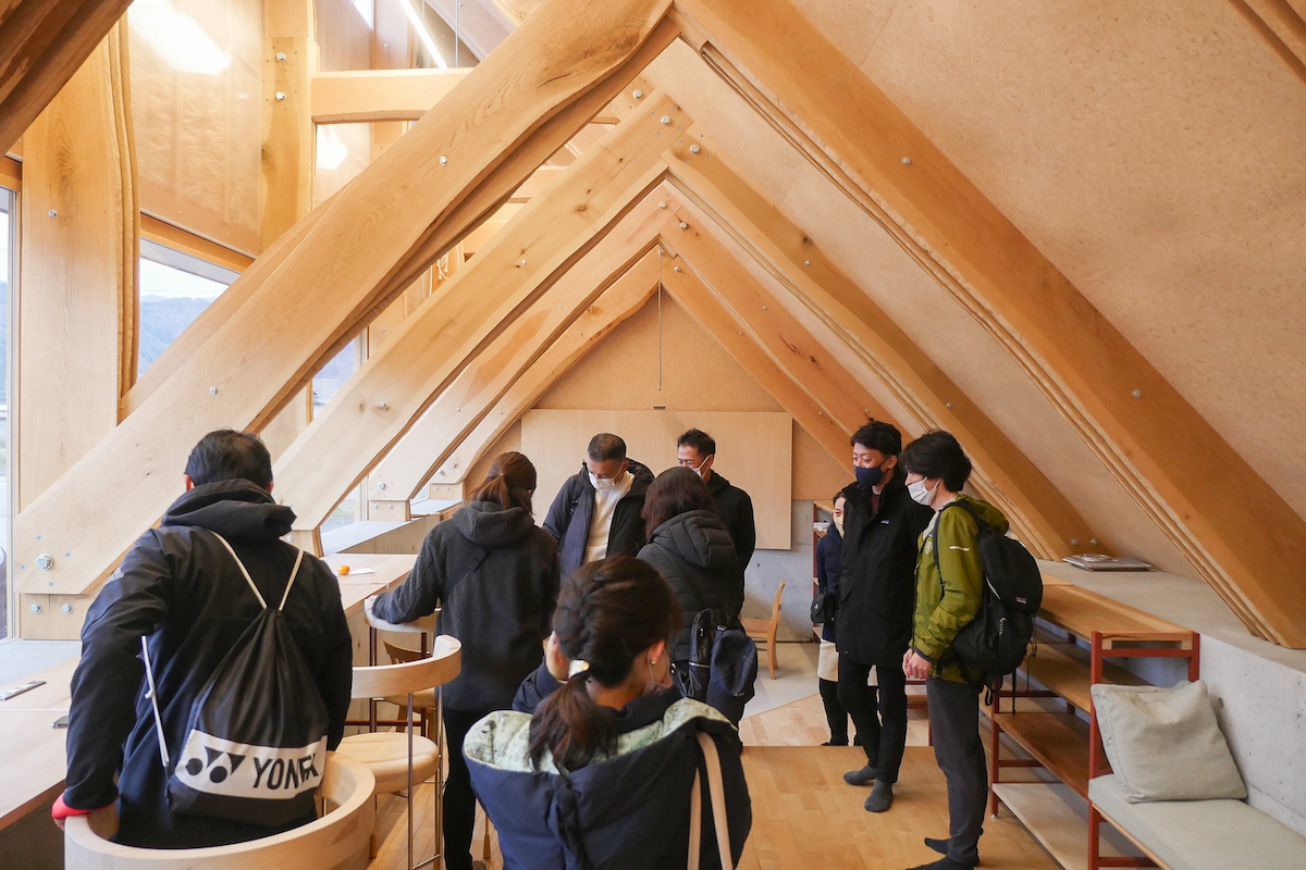 森の端オフィスは、ツバメアーキテクツ+チドリスタジオ+円酒構造設計+ヒダクマと地域事業者が協業し、飛騨の地域資源である広葉樹でつくった建築
