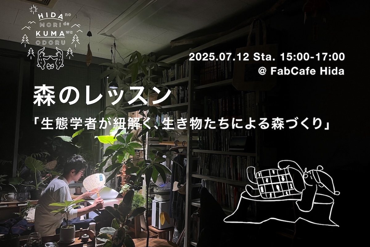 森との関わり方を考えるトークイベント「森のレッスン」を7月12日(土)にFabCafe Hidaで開催します。ゲストは、京都大学生態学研究センター 植物生態学研究室(山尾研究室)の研究者たちです。長い進化の歴史や生き物同士の関わり合いの中で、森はどのようにつくられているのか。森林活用が叫ばれる今だからこそ、改めて生き物たちによる「森づくり」を知り、これからの森と人との関わりについて考えてみませんか?
