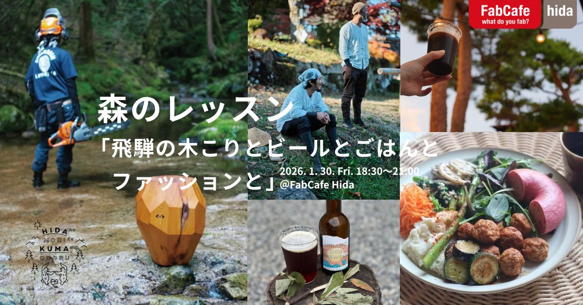 森との関わり方を考えるトークイベント「森のレッスン」を1月30日(金)の夜にFabCafe Hidaで開催。メインゲストは、飛騨高山で新しい木こりの形を模索するGreenRoomの屋号で活躍されている丸山さんです。森林・林業のことを、森を感じるビールやフードやファッションを楽しみながら、みんなで一緒に考えてみませんか?