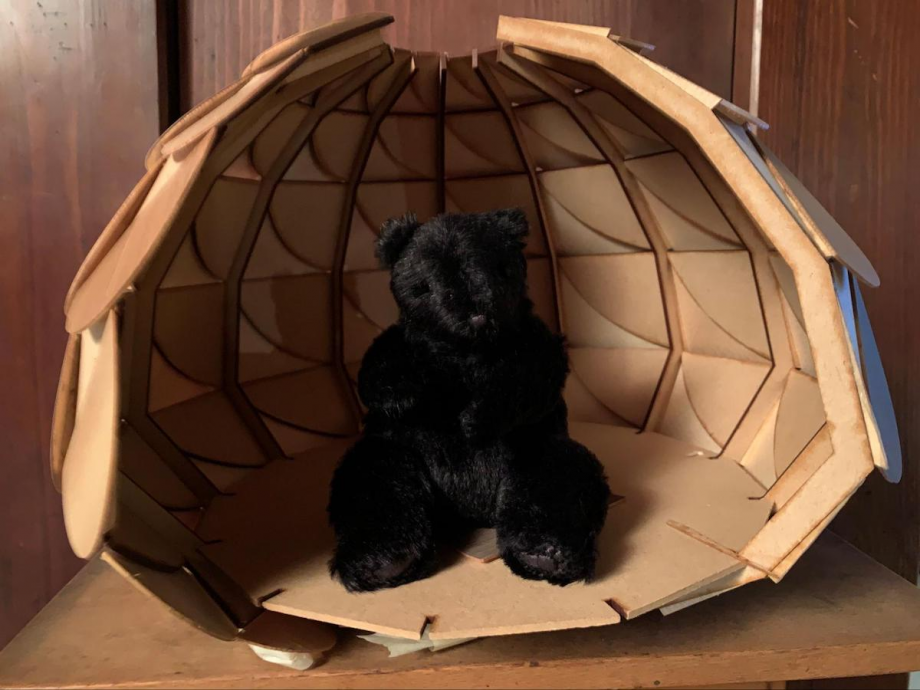 商品開発や空間設計のヒントにも。ツアーに参加してくれた建築家の方が製作した、つくりたい空間の模型と、テディベア作家のツキノワグマのテディベア。