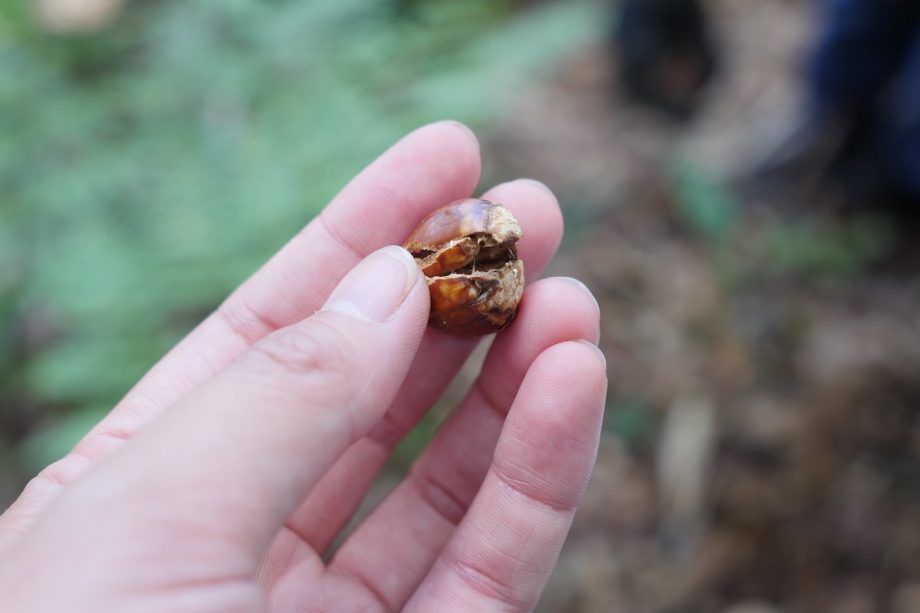 クマが食べた栗の実の跡。実際に森の中を歩いて植物や実を探し、クマが生活できる環境にあるのかをリサーチします。