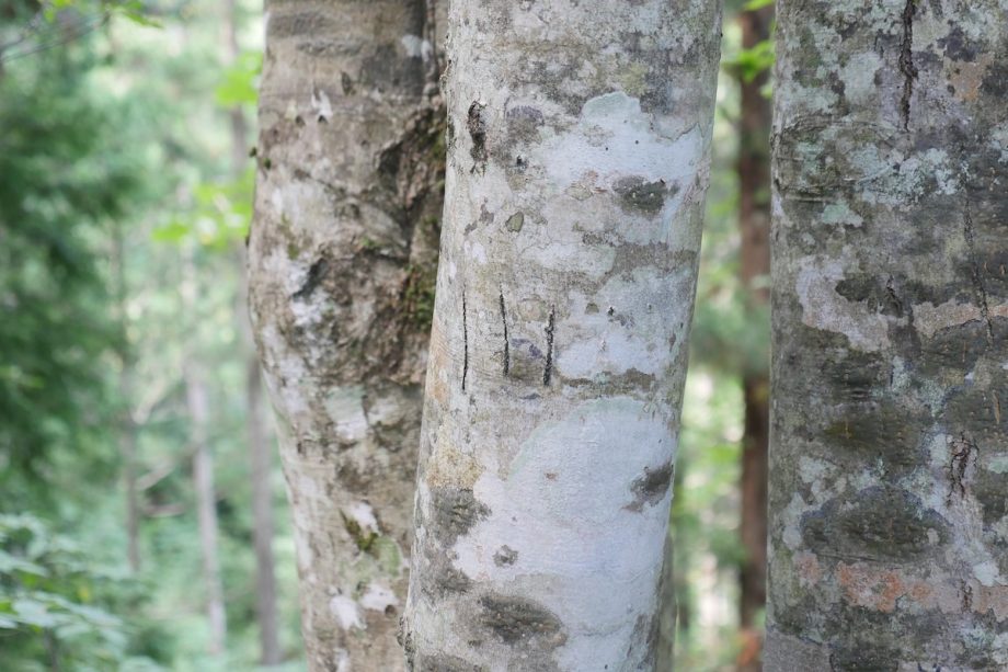 野生動物のフィールドサインを観察し、この森にどんな生き物がいて、どのような暮らしをしているのかを推測します。写真のように木についたクマの爪痕も見つかるかも?