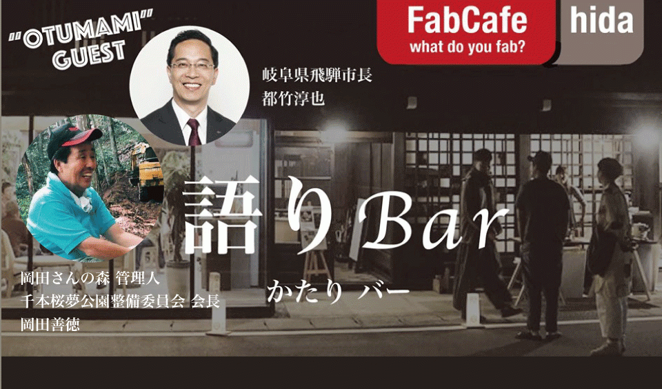 お酒を片手にゆる〜く語らう「語りBar」。今回のゲストは日々進化を続ける「岡田さんの森」の管理人・岡田善徳さん。自分の森をご自身の手で整備し、遊歩道や山小屋をつくり、様々な人に開放しています。聞き手は前回に引き続き都竹淳也飛騨市長がご担当。岡田さんのノウハウや今後の展望などをお伺いします。森と関わりたいと考えている方や、ご自身の森について困ってる方など、本イベントでそのヒントが見つかるかもしれません。ご参加お待ちしております。