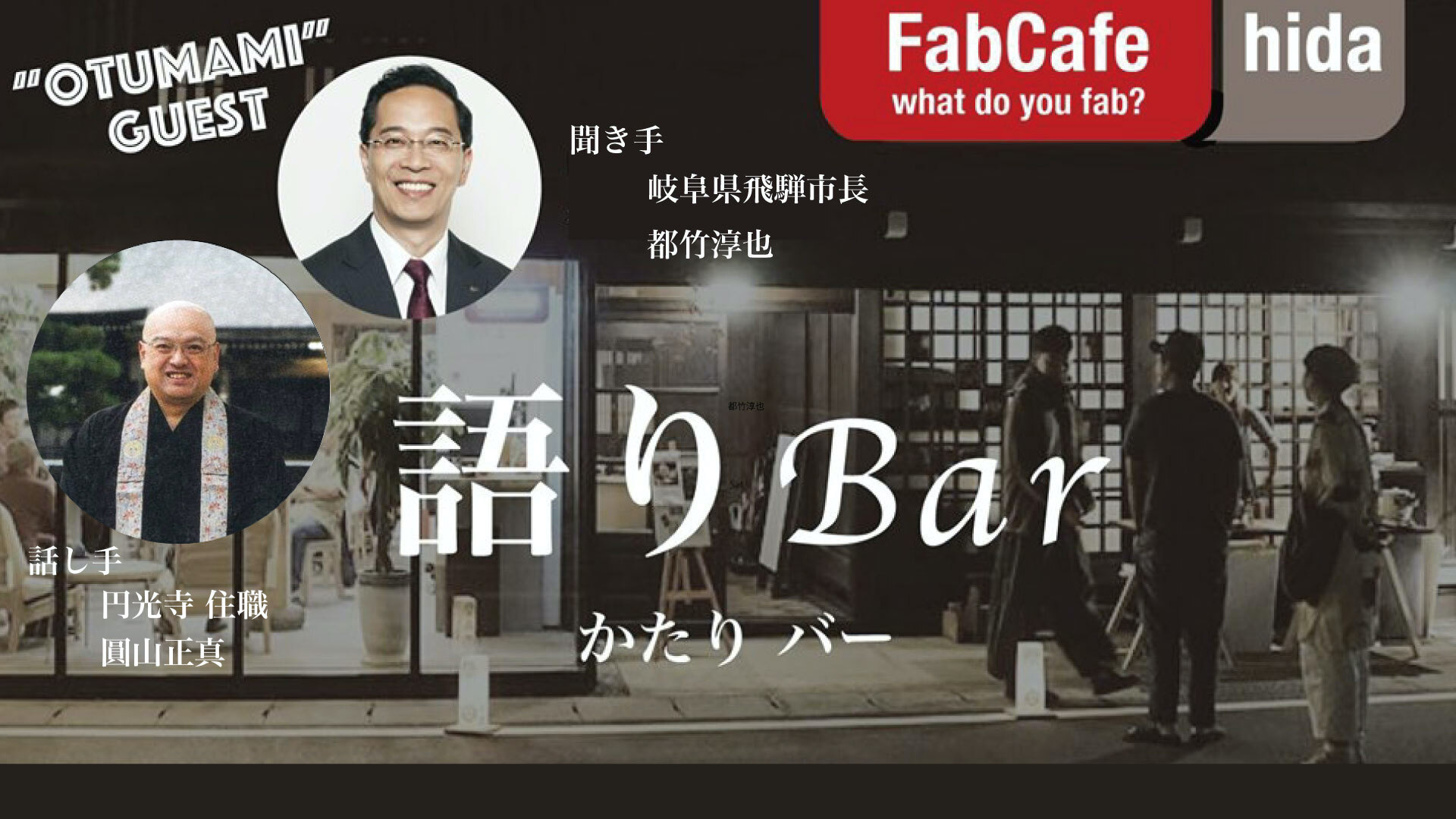お酒を片手にゆる〜く語らう「語りBar」。今回はゲストとして、飛騨古川のお寺、円光寺の住職・圓山正真(マルヤマショウシン)さんをお迎えします。聞き手は、前回に引き続き都竹淳也飛騨市長がご担当。飛騨古川のお寺の成り立ちや、地元の方でも意外と知らないお寺と地域の関わりについてお話しいただきます。