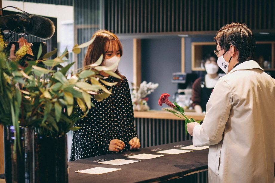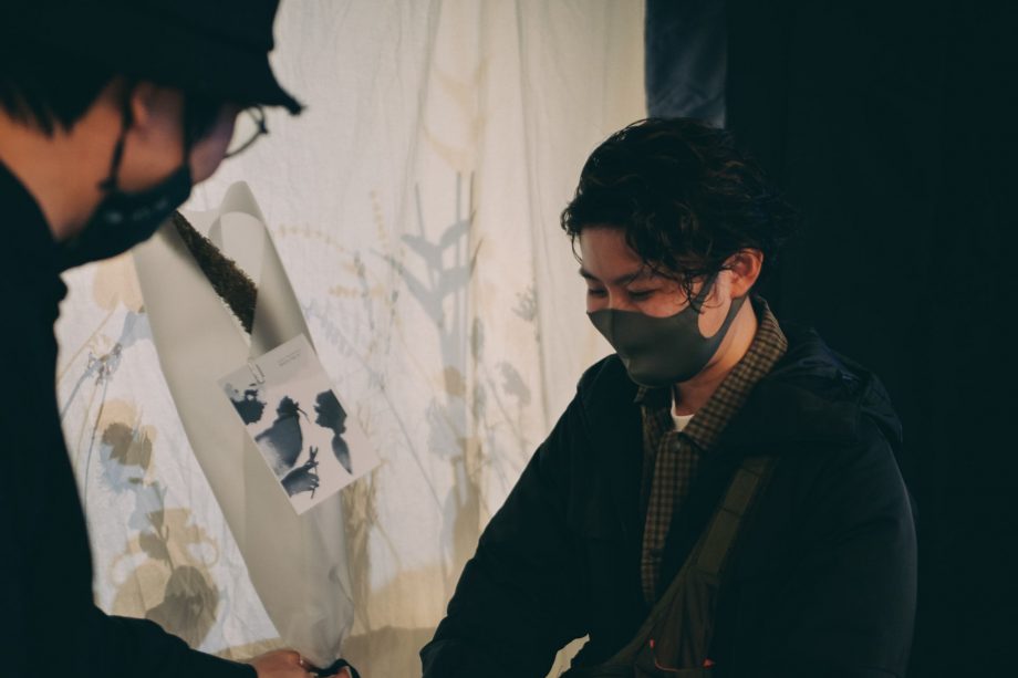 2021年11月25日〜27日に開催された影を売る花屋。一面に張られた布を通して確認できるのは花のシルエットだけ。色も手触りもわからない中で15種類の花からひとつを選び、ブーケにしてもらうというものです。見えないと色や質感を想像で補おうとします。実際の花と想像の揺らぎを楽しむ企画でした。参加者の方からは、「想像してたのと違う!」という歓声が上がっていました。