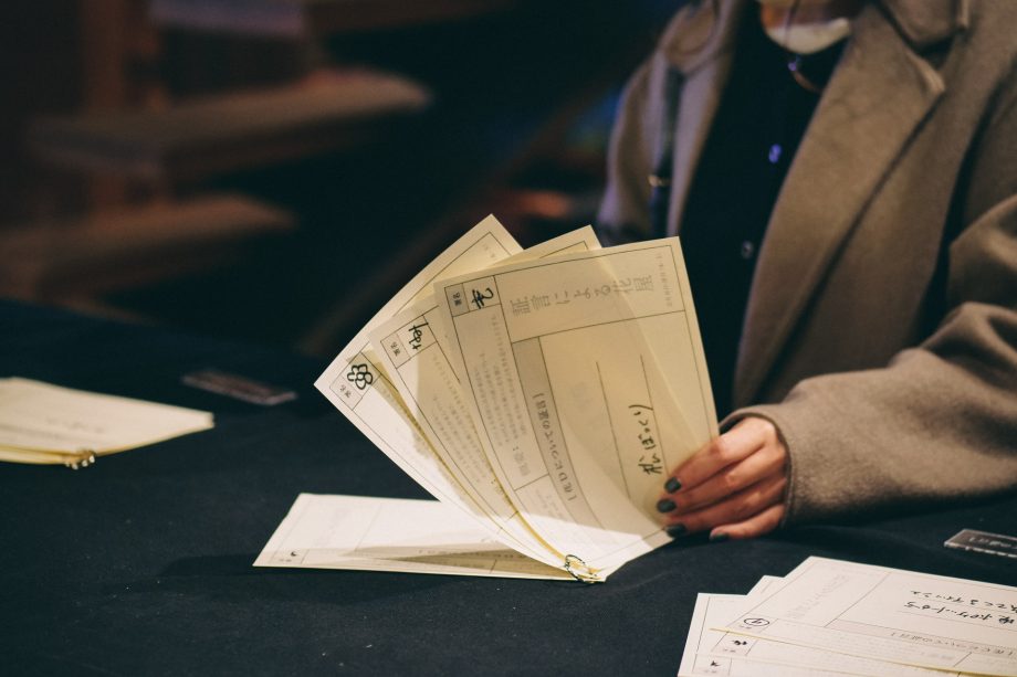 2021年12月16日〜18日に開催されたのは、証言を売る花屋。お店に置かれているのは、花を事前に見た人がその印象を記した花の証言調書です。参加者は、「バターソテーにしたい」「明るいあなたのために」など、証言調書に書かれているさまざまな言葉を見ながら花を選び、自分も実際の花を見て印象を書き残して行きます。花々から受ける印象や連想するイメージは、その人の経験や状況、感情などによってさまざま。どんな想いでその言葉を残したのか想像を巡らせたり、自分が受け取るイメージとの間(あわい)を楽しみながら、五感を刺激するイベントとなりました。