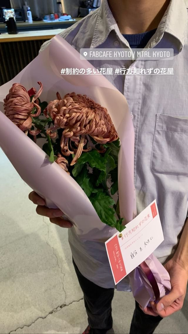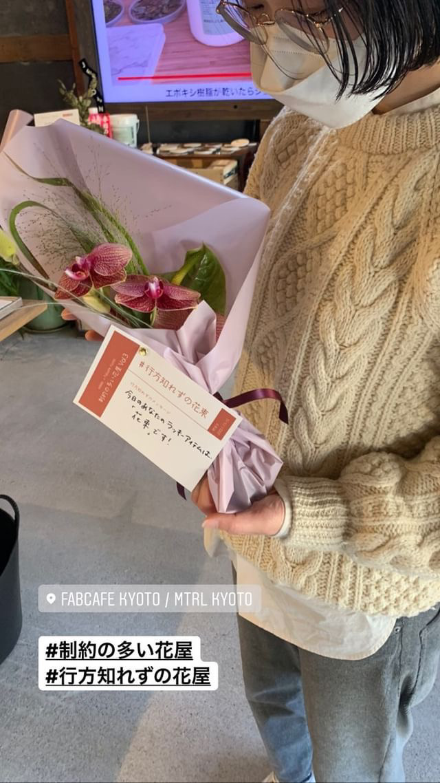 2022年1月13日〜15日に開催された「#行方知れずの花屋」。参加者は誰かがオーダーした花束を受け取り、かわりに次に花を買う「だれか」のために花を選び、一言メッセージを添えました。さらに、自分が受け取った花束を作った人と、自分が作った花束を受け取った人は、FabCafe Kyotoのインスタグラムで確認できるという企画。見知らぬ人同士の花を介したコミュニケーションを楽しむ企画でした。