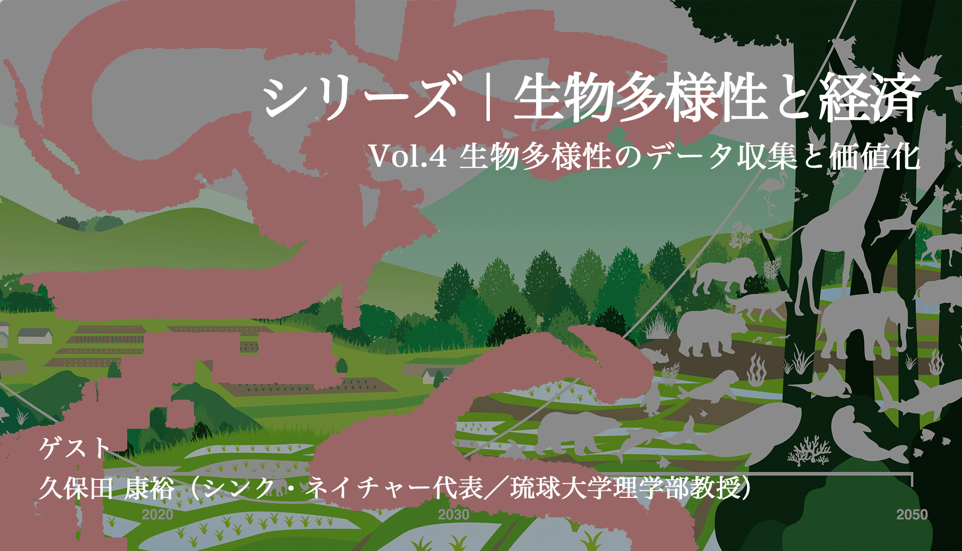 多種共生のデザインがどのように経済活動と結びつき、どのように評価しうるのか、今後の可能性を探るトークシリーズ。最終回、第4回のゲストは琉球大学理学部教授で、株式会社シンク・ネイチャー代表取締役の久保田康裕さん。シンク・ネイチャーは、生物多様性のビッグデータ収集・解析のプロ集団として、積水ハウスの「5本の樹」プロジェクトやサントリー「天然水の森」プロジェクトの事業評価支援などを手がけています。難しいと言われる生物多様性に関するデータ収集と可視化、さらにそれをどう評価/価値化できる形にしうるか、課題や展望をお話しいただきます。