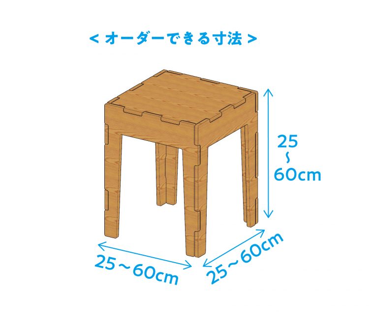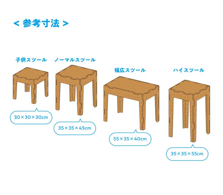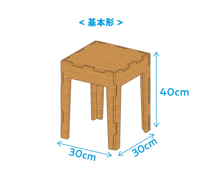 このワークショップでは、縦・横・高さを60cm以内で好きなサイズに設定して、お好みのスツールを作ります。お子様向けの小さいものや、調理に使うハイスツールなど、用途に沿った椅子をお作りいただけます。また、当日はレーザーカッターを使った刻印も体験できます。