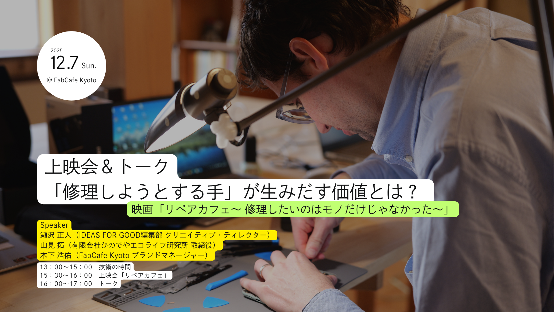 映画「リペアカフェ〜修理したいのはモノだけじゃなかった〜」を上映するとともに、監督の瀬沢正人氏と、京都で8年間「技術の時間」を開催しているひのでやエコライフ研究所取締役山見拓氏、FabCafe Kyotoブランドマネージャーの木下浩佑のトークを開催します。当日は、出張「技術の時間」も開催。修理という行為を考えることは、身の回りのモノやサービスに自分がどのように向き合っているのかを考える機会になりそうです。日頃修理やものづくりに関わりがない方でもぜひお気軽にご参加ください。(主催:ひのでやエコライフ研究所 / 協力:京都市、(公財)京都市環境保全活動推進協会、FabCafe Kyoto)