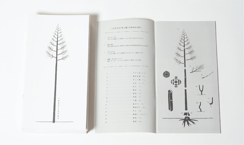 株式会社東京チェンソーズ1本まるごとカタログは、より美しい山づくりを目指す一つの手段として、規格化の流れの中で取り残されてしまった素材を見つめ直す試みです。一本の木からご用意できる全ての素材を網羅しており、これまでの素材生産の過程の中で廃棄されてきた素材や、目にする機会の少ない木の素材を、根っこから葉先まで余すことなくご紹介しています。