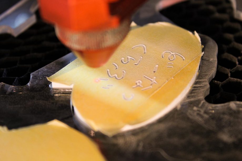 ……型に流し込んだジェスモナイトが固まるのを待っている間に、バッジに乗せる下絵を描いておきます。バッジの形に固まったら、レーザーカッターで絵を彫刻します。(*彫刻はスタッフが担当します。)