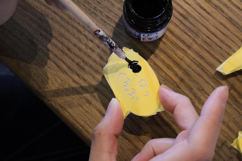 ……彫刻したところに刷毛(はけ)で着色の塗装をします。