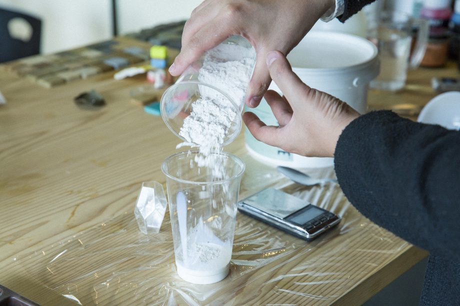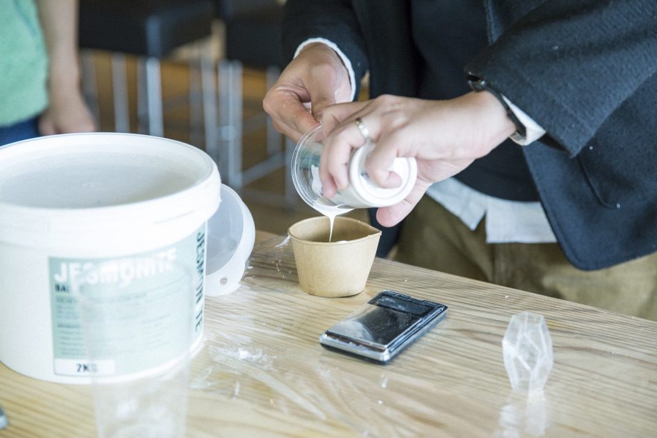 「ジェスモナイト(JESMONITE®)」は、1984年に英国で開発され、ヨーロッパを始め世界中で用いられている造形素材。有機溶剤が一切使われておらず、健康・環境への負荷が小さい先進的な素材としても注目されています。彫刻、建築、内装、家具など、幅広い用途の立体物制作に使用可能。着色剤や金属、石砂等のフィラー添加により、幅広い質感、テクスチャを表現することができます。また、従来の一般的な油性樹脂とは質感が異なり、プラスチック特有のテカリ感がほとんどなく、石のような落ち着いた風合いを特徴としています。