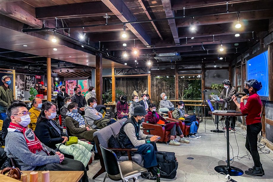 プレゼンテーションの間はお酒を飲みながらのコミュニケーションタイム。プレゼンターと話してみたり、他の参加者と交流してみたり、MTRL KYOTO 内を観覧したり、386平米のクリエイティブな空間で自由にお楽しみください。