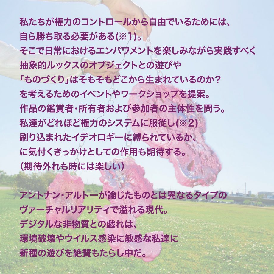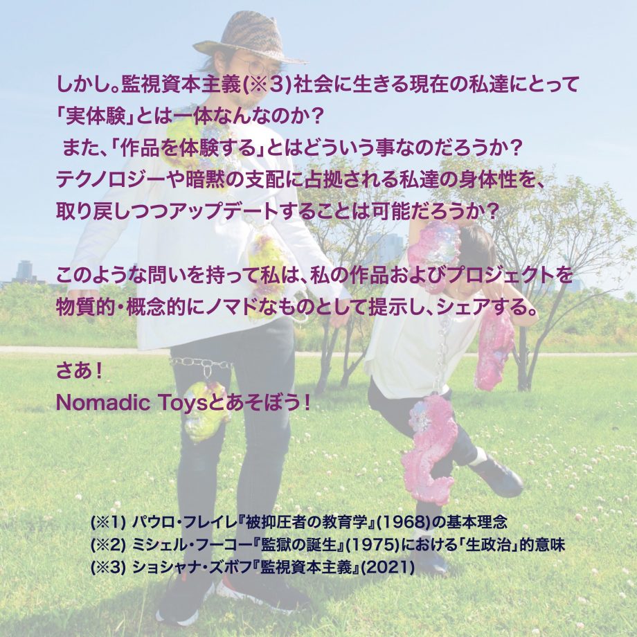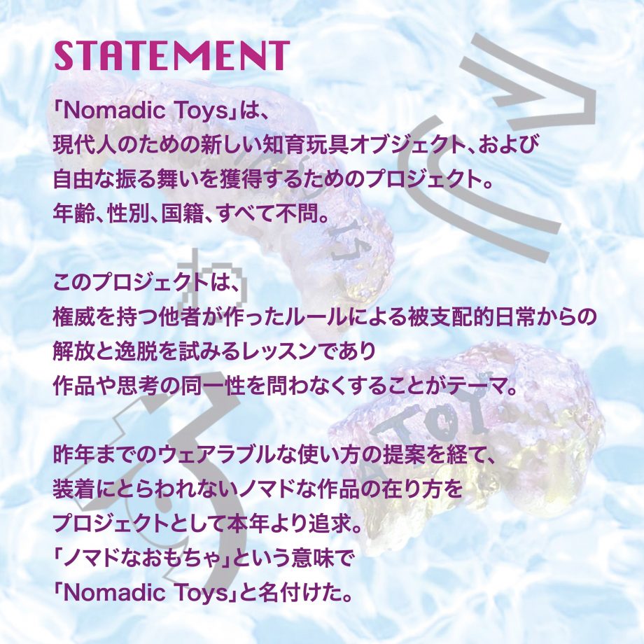 「I make things to blur the boundaries」をモットーに「Nomadic Toys(遊牧する玩具)」という名のプロジェクト・作品制作を行う。これは、個人の性質や些細な物事がパワー(権力)に回収され、弱体化を余儀なくされる社会システムの構造に抵抗しつつ共存してみるための活動。WS・イベント・展示の参加者や鑑賞者には、作品の展示場所/使用法/イデオロギー/権威的圧力などの枠に縛られないノマディックな振る舞いをゆるしている。視覚作品として、ふれあうことを前提に作られた不定形のオブジェクト、ドローイング、アクセサリーとして使えるウェアラブルワークがある。
