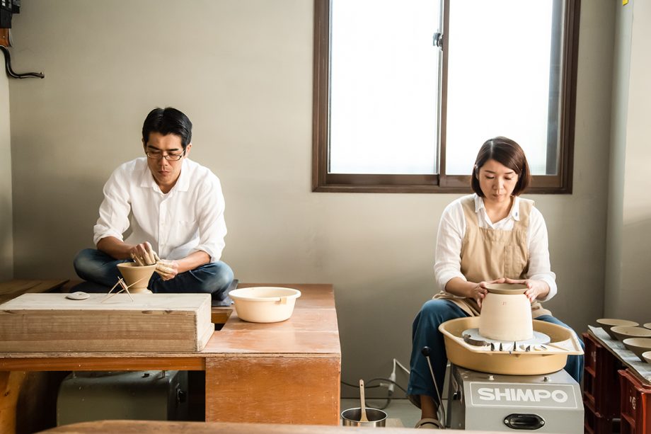 現在 蘇嶐窯にて作陶活動中蘇嶐窯は、京都・清水焼と福岡・小石原焼に伝わる技術をそれぞれ受け継ぐ職人が互いの技を融合し、夫婦で作陶活動をしています。 蘇嶐窯の青磁は「練り込み青磁」といい、生地に顔料を練り込み釉薬を掛けることで、深みのある青を表現しています。そこに小石原焼の技法の「飛かんな」を入れることで、削られた土の溝に釉薬が溜まり規則的な文様が浮かび上がります。こうして他にはない新しい青磁の世界を模索しています。蘇嶐窯が目指す色は、雨上がりの空のような青さです。この澄んだ青をたくさんの人に伝えたいという想いから、美しさと機能性を兼ね備えた商品作りに取り組んでいます。私たちの紡ぐストーリーと器が、皆様の食卓に彩りを添えるお手伝いができましたら幸いです。