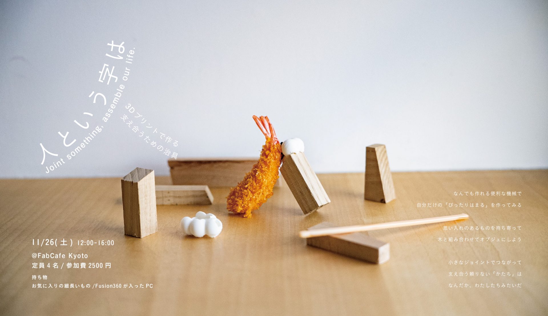思い入れのあるものを持ち寄り、木片と組み合わせて人という字を組み立てます。持ち寄ったものと木片をつなぐためのジョイントをモデリングし3Dプリントしてみることで、採寸からモデリング、ものを組み立てるところまでを体験します。未知のマシンに思える3Dプリンターが、手仕事の延長にある身近な存在であることに気付くためのきっかけを作ります。3Dモデリングや3Dプリンターがまったく初めて、という方もお気軽にご参加ください。
