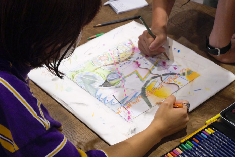 「大切なパートナーと対話しながら一つの絵画作品をともにつくる」ワークショップです。「曲線」と「直線」を2人で交互に描きながら連想ゲームのように進めていくと最終的に2人からしか生まれ得ない、世界でたった1つの絵画(物語)が出来上がります。(主催:垂谷知明[現代美術家、画家] / 協力:FabCafe Kyoto)