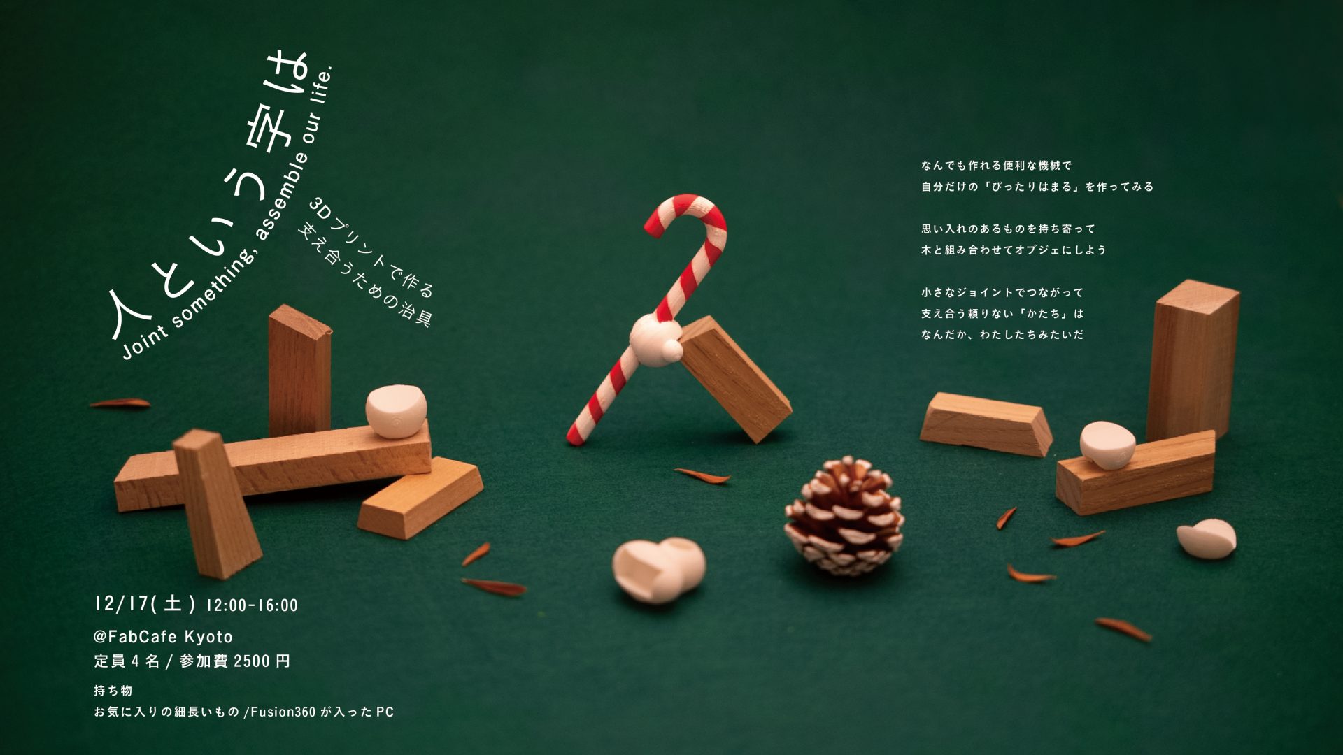 思い入れのあるものを持ち寄り、木片と組み合わせて人という字を組み立てます。持ち寄ったものと木片をつなぐためのジョイントをモデリングし3Dプリントしてみることで、採寸からモデリング、ものを組み立てるところまでを体験します。未知のマシンに思える3Dプリンターが、手仕事の延長にある身近な存在であることに気付くためのきっかけを作ります。3Dモデリングや3Dプリンターがまったく初めて、という方もお気軽にご参加ください。