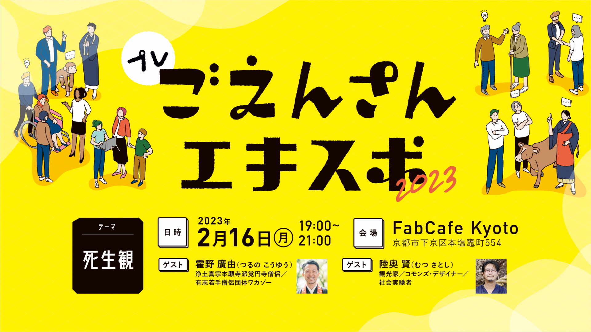 お坊さんもお坊さんじゃない人もあつまれ!「プレごえんさんエキスポ」は、みんなで「いきかた」を考える連続イベントです。今回は「逃げ」「受け止め」「向き合い」をテーマに、さまざまな方とお話を深めていきます。秋以降(予定)には大型のイベントも開催するので、ぜひたくさんの方にご参加いただき、なかまになっていただけるとうれしいです。【主催:真宗教団連合/企画運営:ごえんさんエキスポ実行委員会・株式会社ここにある/協力:FabCafe Kyoto】