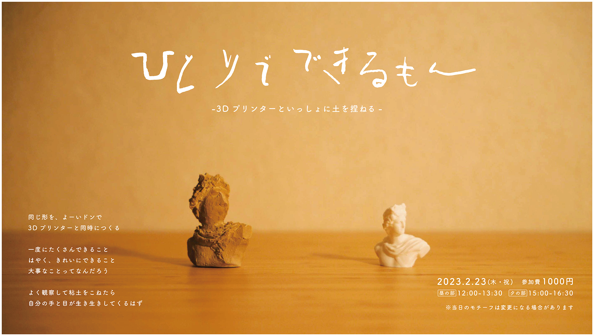 綺麗に作れること、速く、安く作れること、多く作れること......私たちが何かをつくるとき、本当に大事なことは何でしょうか。久しく自分の手で何かを作っていないあなた、久しぶりに粘土をこねて、自分の目と手のひらの感覚を取り戻してみませんか?