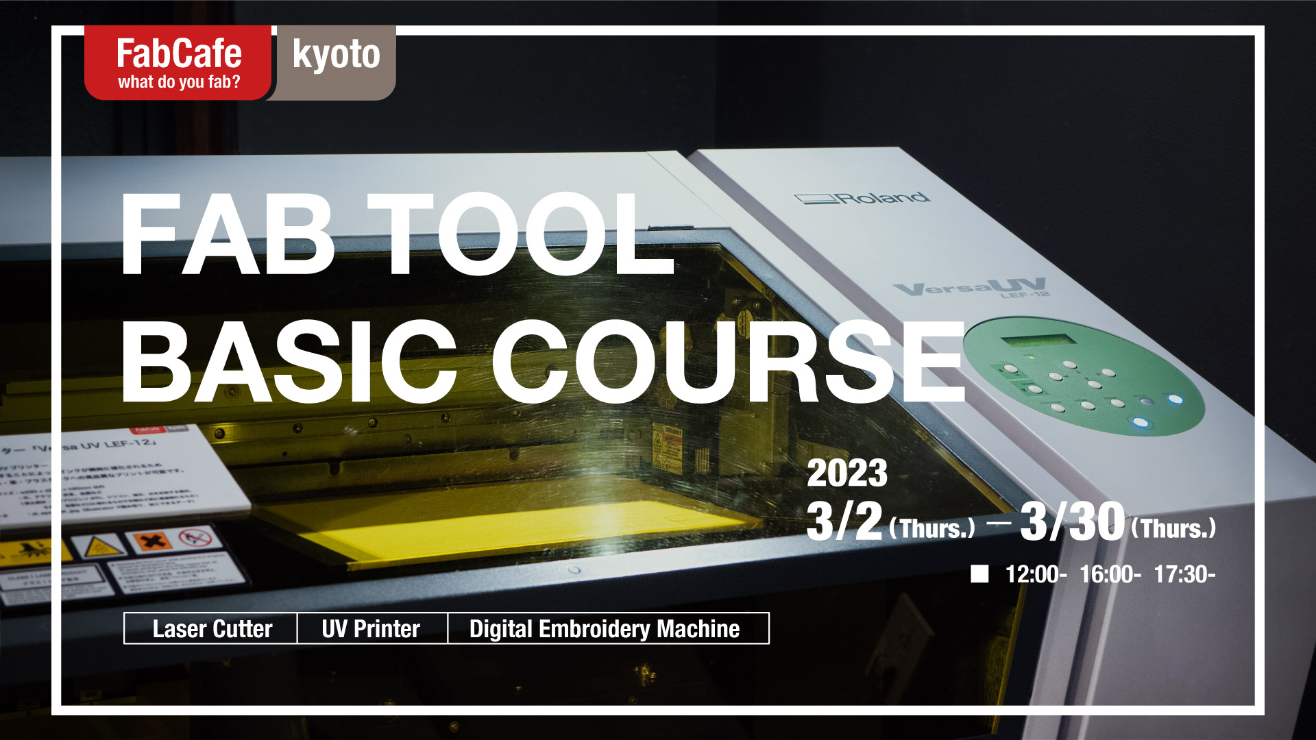 FabCafe Kyotoのレーザーカッター、UVプリンター、デジタル刺繍ミシンの基本操作方法についての講習会です。この講習会を受講し、安全に操作する方法を習得していただいた方は、セルフサービスにて対象機器を使用することができるようになります。