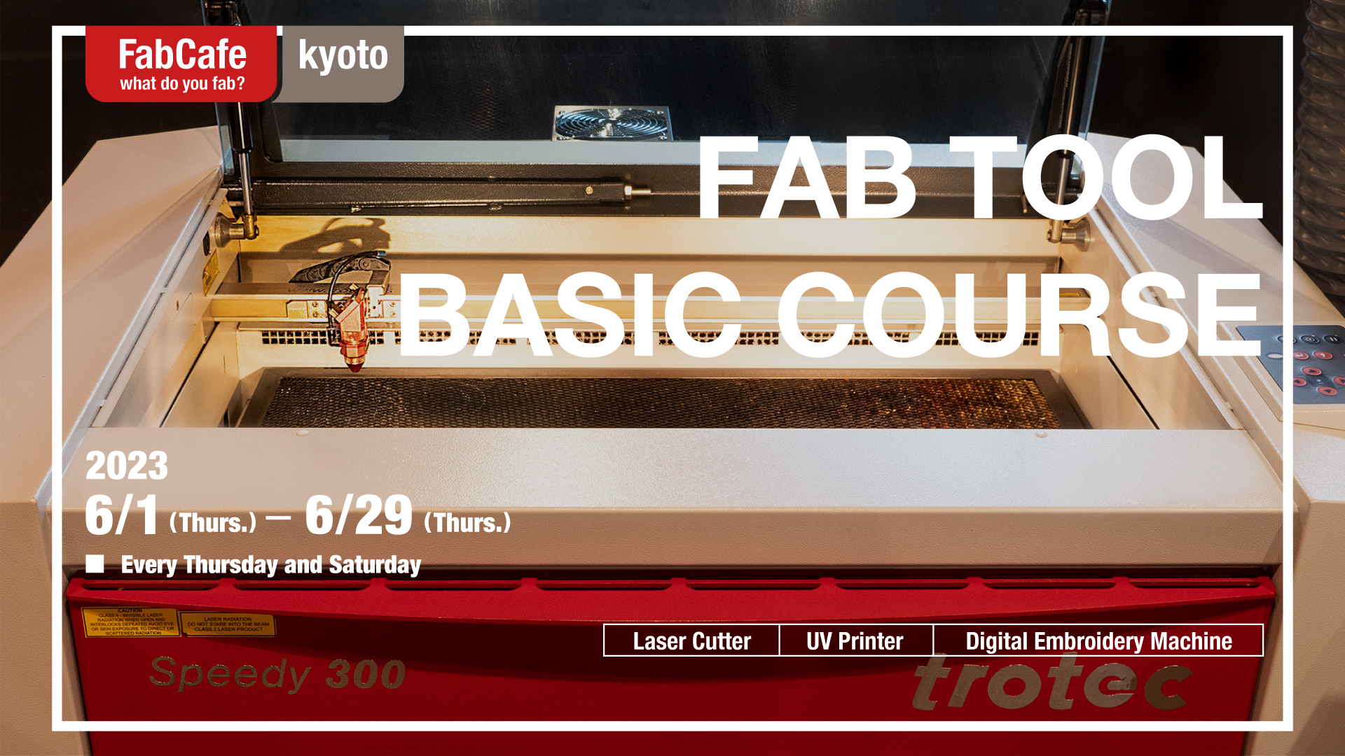 FabCafe Kyotoのレーザーカッター、UVプリンター、デジタル刺繍ミシンの基本操作方法についての講習会です。この講習会を受講し、安全に操作する方法を習得していただいた方は、セルフサービスにて対象機器を使用することができるようになります。