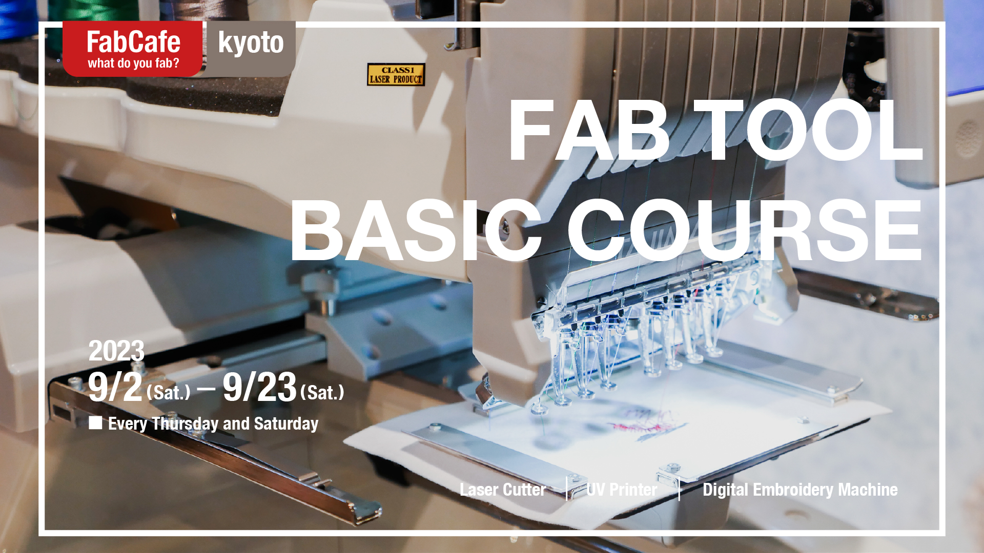 FabCafe Kyotoのレーザーカッター、UVプリンター、デジタル刺繍ミシンの基本操作方法についての講習会です。この講習会を受講し、安全に操作する方法を習得された方は、セルフサービスにて対象機器がご利用になれます。
