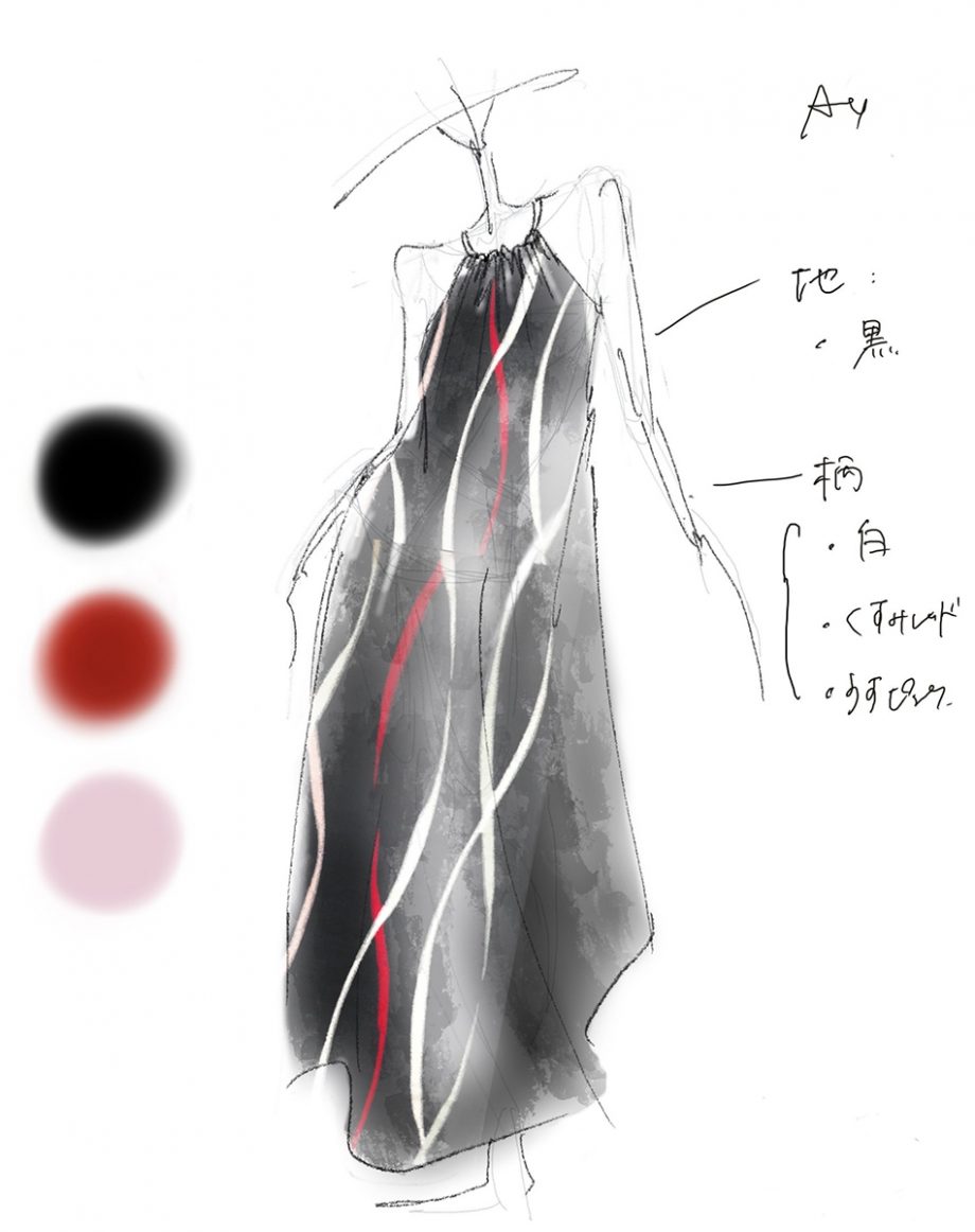 そこで、Fabcafe Kyotoで「あいのぬの」シリーズを披露いたします。銘仙の柄からインスピレーションを得て、現代技術でオリジナルテキスタイルを開発しました。これは銘仙そのものではなく、私たちの解釈とデザインによるものですが、銘仙の特徴的な柄を保ちながら新たな表現を試みました。そのテキスタイルをAyらしいデザインで衣服に仕立て、立体感豊かなジャガード織りでワンピースを製作し、またプリント技術で銘仙の大胆な色使いを再現したセパレート浴衣を生み出しました。